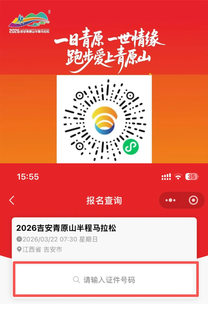 一日青原,一世情缘跑步爱上青原山2026吉安青原山半程马拉松半程参赛号码现开放查询快来领取属于你的幸运号码吧~查询方式一:扫码,输入身份证号码即可查询方式二:组委会发短信通知参赛号,请留意查收!立即查号,获取你的吉安青马专属ID!3月22日..
